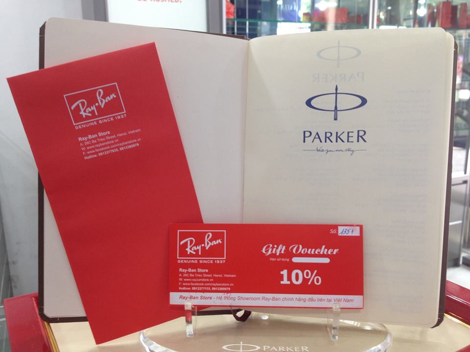 # Áp dụng với tất cả các đơn hàng có tổng giá trị trên 2 triệu đồng tại các gian hàng Parker & Waterman, khách hàng sẽ được tặng 01 sổ da cao cấp và 01 Voucher mua kính mắt Rayban chính hãng tại 26C Bà Triệu.